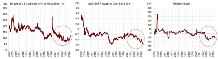 注:1)参考文献Szoke等(2024)、 Krishnamurthy和Vissing-Jorgensen(2012)、 Du等(2023)、Schnabel(2024)、Obstfeld和Zhou(2023)。2)右图Treasury Basis为3个月期美债利率相对于8种外币( CAD, CHF, DKK, EUR, GBP, JPY, NOK 和 SEK )CIP条件的差值的均值,即其中, 和分别为3个月外币国债和美债收益率, 和分别为即期和3月期远期汇率。3)图中均为10日均值线;资料来源:Bloomberg,中金公司研究部