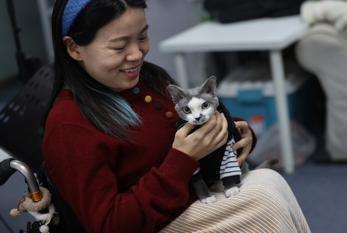 程利婷与自己的小猫“多多”互动。
