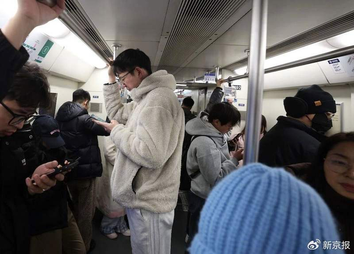 苏佳宇在乘坐地铁通勤。马凡氏综合征使他看起来比常人高大。