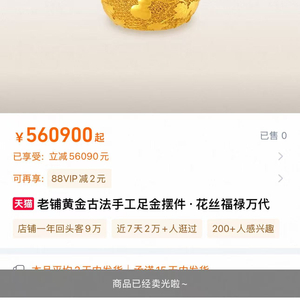 据了解,2月26日下午14点,老铺黄金线上店铺开启1000元立减100元活动。活动开始不足10分钟,老铺黄金天猫旗舰店大面积产品售罄、下架,包括售价17万元的黄金貔貅、超过30万元的黄金蟾蜍以及超过50万元的黄金鸳鸯摆件,超过60万的金碗等高价商品。