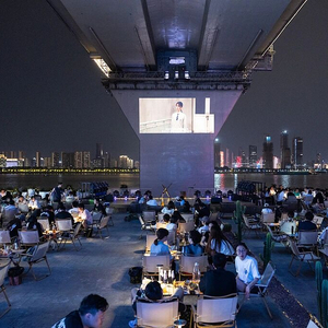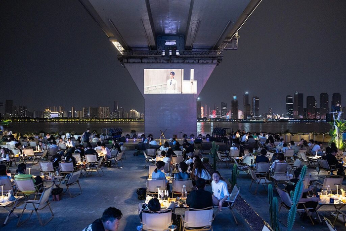 2024年6月3日晚,武汉长江二桥的临江桥墩化身巨大的电影幕布,正下方的江滩“变身”别具一格的露营地,众多年轻人在这里看电影