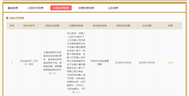 扬子晚报网2月27日讯(记者 万凌云 姜天圣)据国家企业信用信息公示系统日前公开的行政处罚公告,丹阳市珥陵镇沛琴小吃店,因使用不符合食品安全标准的原料、食品添加剂和食品相关产品,或者超范围、超限量使用食品添加剂行为被罚款3000元、没收违法所得100元。