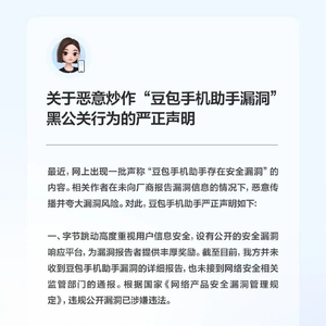 2月27日,@豆包手机助手 发布声明称,近期,网上出现一批声称“豆包手机助手存在安全漏洞”的内容。相关作者在未向厂商报告漏洞信息的情况下,恶意传播并夸大漏洞风险。截至目前,并未收到豆包手机助手漏洞的详细报告,也未接到网络安全相关监管部门的通报。