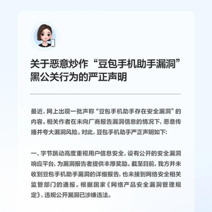 豆包手机助手2月27日发布《关于恶意炒作“豆包手机助手漏洞”黑公关行为的严正声明》: