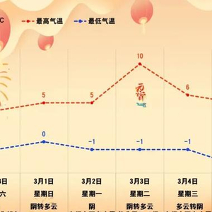 3月3日(元宵节)白天最高气温将升至10℃左右,大部分时间比较适宜大家出行,夜间最低气温-1℃,户外活动需注意保暖。下周冷空气活动频繁,天空云量较多,气温波动起伏,请关注临近预报,根据天气和气温变化,适时调整着装。