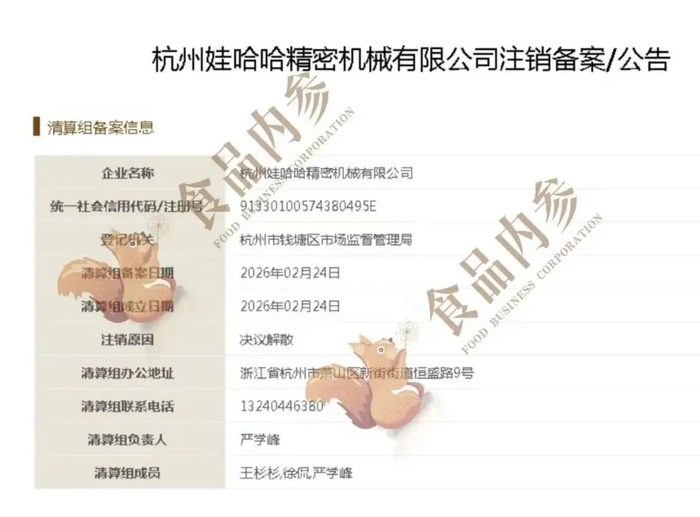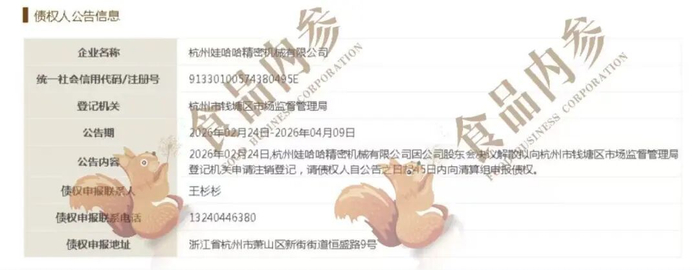 公开信息显示,2026年2月24日,杭州娃哈哈精密机械有限公司因公司股东会决议解散,拟向杭州市钱塘区市场监督管理局登记机关申请注销登记,请债权人自公告之日起45日内向清算组申报债权。
