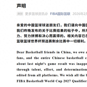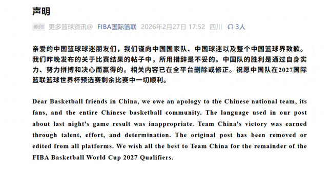 亲爱的中国篮球球迷朋友们,我们谨向中国国家队、中国球迷以及整个中国篮球界致歉。我们昨晚发布的关于比赛结果的帖子中,所用措辞是不妥的。中国队的胜利是通过自身实力、努力拼搏和决心而赢得的。相关内容已在全平台删除或修正。祝愿中国队在2027国际篮联篮球世界杯预选赛剩余比赛中一切顺利。