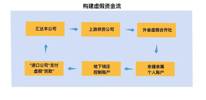 顺着这条异常的资金线索深查,一条清晰的虚假循环路径浮出水面:汇达丰公司收到外汇或者退税款后,便迅速以“货款”名义转给上游供货商,上游供货商随即转给合作社,合作社扣除部分费用后,退税款最终转入余建亲属的银行账户,外贸货款则转入地下钱庄交易人员的账户。