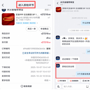 为保障交易安全,主流电商平台针对黄金等贵重商品设立了质检发货流程。人民网记者以开店者身份咨询获悉,抖音、快手均要求商品送至平台指定质检仓,查验合格后方可发出。