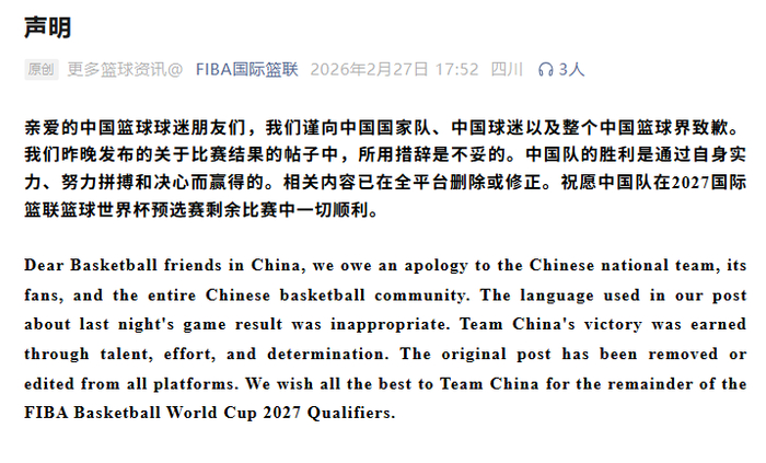 亲爱的中国篮球球迷朋友们,我们谨向中国国家队、中国球迷以及整个中国篮球界致歉。我们昨晚发布的关于比赛结果的帖子中,所用措辞是不妥的。中国队的胜利是通过自身实力、努力拼搏和决心而赢得的。相关内容已在全平台删除或修正。祝愿中国队在2027国际篮联篮球世界杯预选赛剩余比赛中一切顺利。