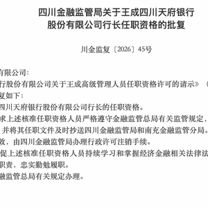 根据四川金融监管局发布的《关于王成四川天府银行股份有限公司行长任职资格的批复》(川金监复〔2026〕45号),王成的行长任职资格于2026年2月12日获得核准。四川天府银行亦随后发布公告,确认已收到该核准批复。