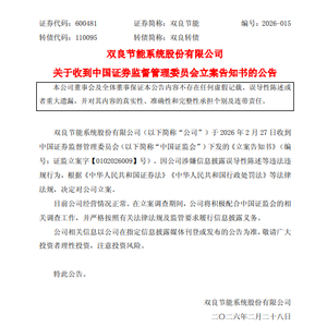 2月27日晚,双良节能(600481)公告,公司于当日收到中国证监会下发的《立案告知书》。因公司涉嫌信息披露误导性陈述等违法违规行为,根据《中华人民共和国证券法》《中华人民共和国行政处罚法》等法律法规,中国证监会决定对公司立案。