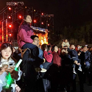 快递小哥仲举(前排戴眼镜者)带着女儿观看灯会表演。姜珊/摄