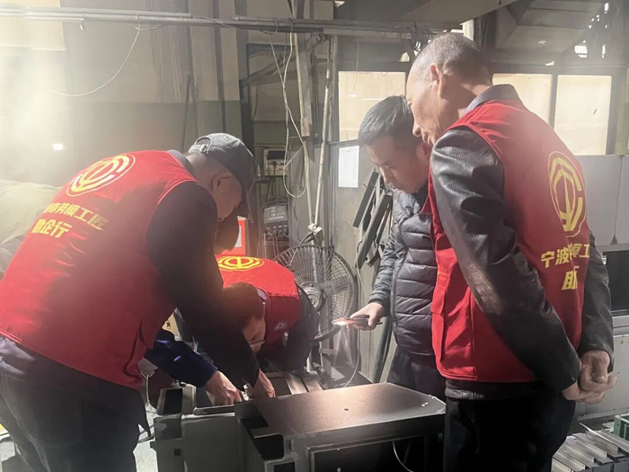 奉化区劳模工匠技术服务队在菲睿机械排查问题.