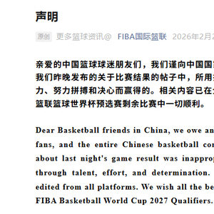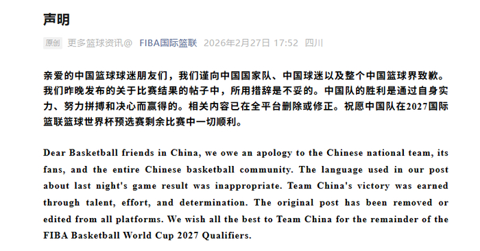 亲爱的中国篮球球迷朋友们,我们谨向中国国家队、中国球迷以及整个中国篮球界致歉。我们昨晚发布的关于比赛结果的帖子中,所用措辞是不妥的。中国队的胜利是通过自身实力、努力拼搏和决心而赢得的。相关内容已在全平台删除或修正。祝愿中国队在2027国际篮联篮球世界杯预选赛剩余比赛中一切顺利。