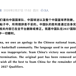 亲爱的中国篮球球迷朋友们,我们谨向中国国家队、中国球迷以及整个中国篮球界致歉。我们昨晚发布的关于比赛结果的帖子中,所用措辞是不妥的。中国队的胜利是通过自身实力、努力拼搏和决心而赢得的。相关内容已在全平台删除或修正。祝愿中国队在2027国际篮联篮球世界杯预选赛剩余比赛中一切顺利。