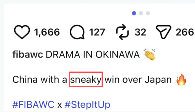 2月26日中国男篮在冲绳客场87比80逆转日本队后,FIBA篮球世界杯官方社媒账号在战报里写下“China with a sneaky win over Japan”(“sneaky”在英语里带着“鬼鬼祟祟、不光彩”的暗示,多家媒体译作“偷走一场胜利”),随即引发舆情。相关帖文随后被删除;2月27日,FIBA在其官方微信发布中英双语致歉,明确向中国国家队、中国球迷以及中国篮球界致歉,承认措辞不妥,并强调中国队胜利来自实力、拼搏与决心。