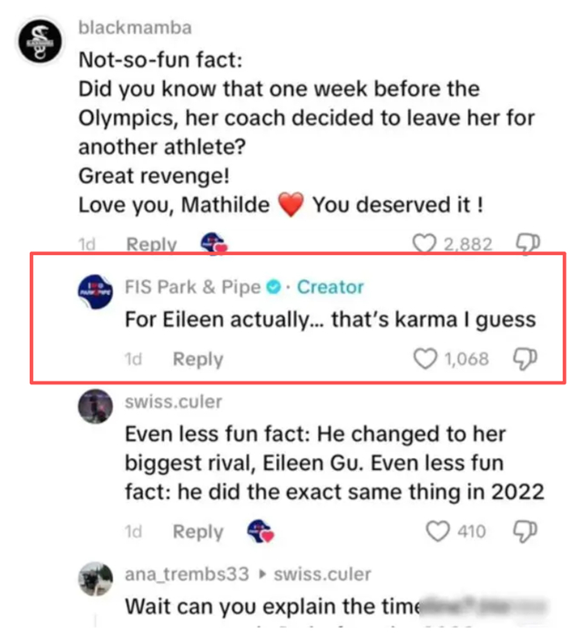 冬奥会期间,国际滑雪和单板滑雪联合会(FIS)也踩过同样的“雷”。FIS旗下官方TikTok账号“FIS Park & Pipe”在一条关于瑞士选手玛蒂尔德·格雷莫德夺得女子坡面障碍技巧金牌的视频评论区,先有网友抛出所谓“不那么有趣的事实”,声称格雷莫德的教练在冬奥前一周“离开她去带另一名运动员”,并把夺金形容为“复仇”“是你应得的”。该官方账号随后竟跟评称:“对谷爱凌而言……我猜这就是所谓的‘因果报应’。”把谷爱凌未能夺金轻飘飘地归因为“karma”(常被理解为“现世报”)。事件引发外界强烈不满后,相关评论被删除;据报道,FIS也就此致歉。