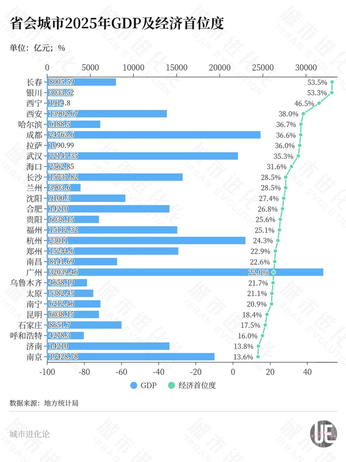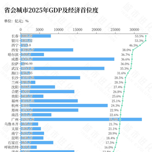 事实上,放在全国范围内来看,省会经济首位度高的省份多位于西北地区。2025年,有3个省会城市的经济首位度在40%以上,其中宁夏银川、青海西宁都位于西北地区。陕西西安也紧随其后,以38%的经济首位度位居全国第4。