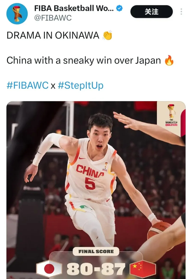 实力打脸!FIBA官方社媒称“中国男篮偷走胜利”,评论区翻车后火速改文案