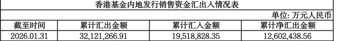 国家外汇管理局的数据显示,截至2026年1月底,香港基金内地发行销售资金累计净汇出金额约为1260.24亿元,连续6个月位于1200亿元之上。