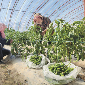 2月25日,记者走进海西蒙古族藏族自治州德令哈市柯鲁柯镇金原村辣椒采摘基地,翠绿欲滴的辣椒挂满枝头,村民正忙着采摘,开启了新一年的忙碌劳作。新鲜蔬菜采摘后就能直接供应市场,既丰富了市民的“菜篮子”,又带动了村民就近就业、稳定增收。近年来,金原村立足自身资源禀赋与发展优势,成立景润种植专业合作社,选定花卉苗木种植、果蔬采摘作为特色产业发展方向,积极推行“党支部+合作社+农户”发展模式,不断发展壮大村集体经济。本报记者 栾雨嘉 苏烽 摄