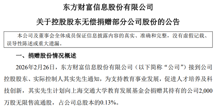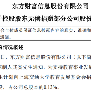 据澎湃新闻消息,2月26日,东方财富信息股份有限公司(以下简称“东方财富”)发布公告称,接到公司控股股东、实际控制人其实通知,为支持教育事业发展,促进人才培养及科技创新,其实计划向上海交通大学教育发展基金会捐赠其持有的公司2000万股无限售流通股,占公司总股本的0.13%。
