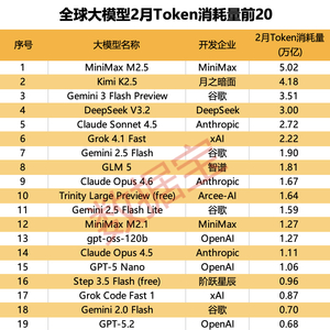 其中,MiniMax M2.5以超过5万亿的Token消耗位居全球榜首;Kimi K2.5紧随其后,2月Token总消耗量超过4万亿;DeepSeek V3.2、GLM 5分别位列第四、第八位。这些头部国产大模型,普遍聚焦于代码能力与智能体(Agent)自动化任务的能力提升。