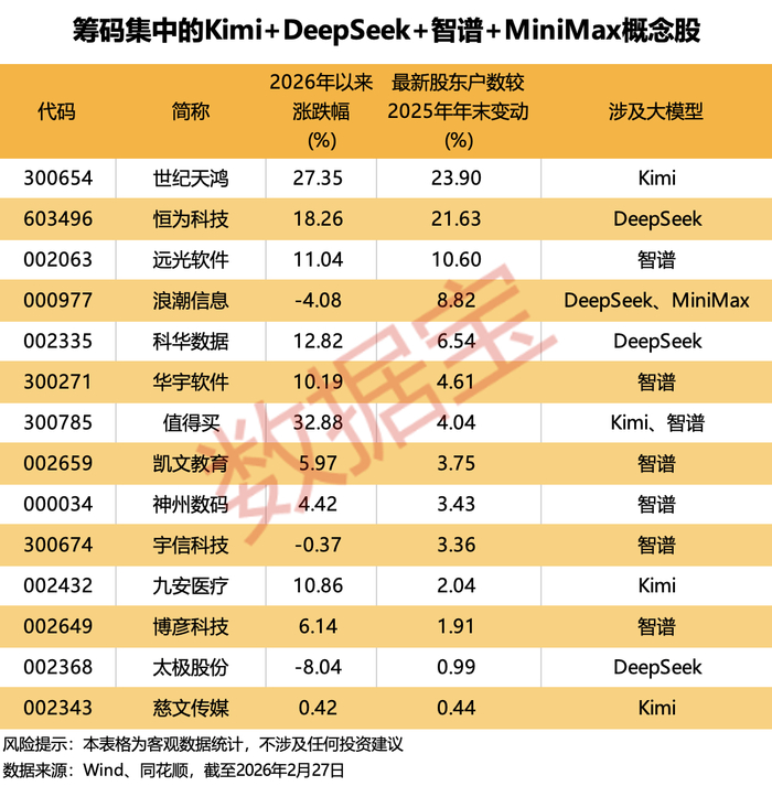 证券时报·数据宝根据万得、同花顺等公开信息梳理,A股市场中属于智谱、Kimi、DeepSeek及MiniMax主流大模型的概念公司有140余家。