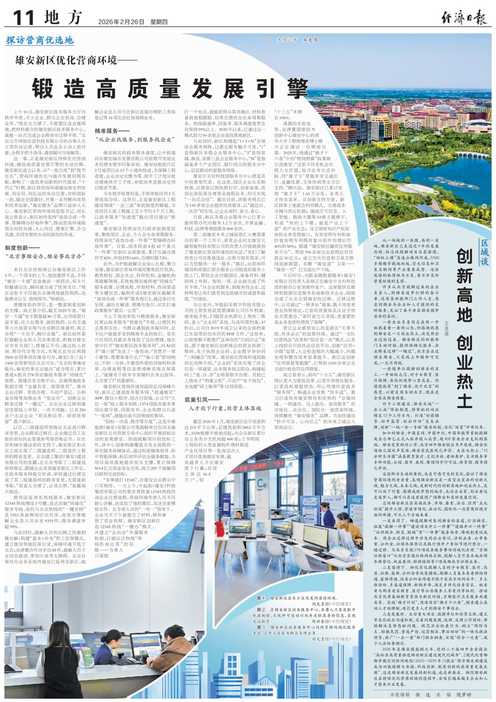 2月26日,《经济日报》推出整版报道《雄安新区优化营商环境——锻造高质量发展引擎》。报道介绍,雄安新区自设立以来,将优化营商环境作为驱动高质量发展的核心引擎,通过制度创新与精准服务,持续擦亮“雄安服务”品牌。在制度创新层面,雄安新区积极推动京雄“同城化”,截至2025年底,“雄安一卡通”发卡超80万张,实现人社、就医、交通等六大场景跨区域通用;搭建政务数据共享平台,实现京雄两地3500余项事项互办,250余家北京企业通过“一键迁”落户。在精准服务方面,新区持续深化“高效办成一件事”改革,依托12345热线“一键办”及“1+3+N”涉企服务网络,为企业提供全生命周期帮办服务。