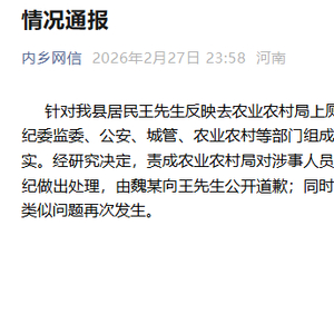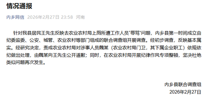 据“内乡网信”微信公众号2月27日深夜消息,内乡县联合调查组发布情况通报称,经初步调查,反映基本属实。涉事人员魏某为县农业农村局门卫,其下属企业职工。责成该局对魏某依规依纪做出处理,由魏某向王先生公开道歉。