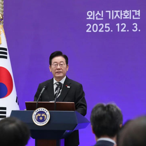 2025年12月3日,在韩国首尔青瓦台迎宾馆,韩国总统李在明举行外媒记者会。新华社记者姚琪琳摄