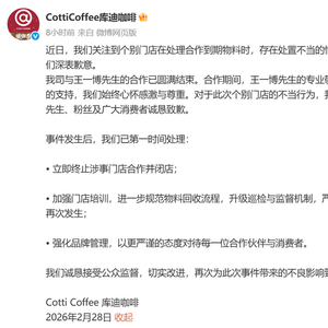 对于该事件,库迪咖啡表示,事件发生后,已第一时间处理:立即终止涉事门店合作并闭店;加强门店培训,进一步规范物料回收流程,升级巡检与监督机制,严防类似情况再次发生;强化品牌管理,以更严谨的态度对待每一位合作伙伴与消费者。