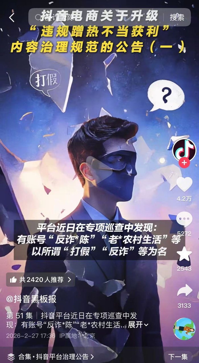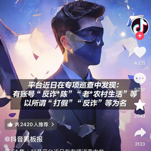 抖音黑板报称,抖音平台近日在专项巡查中发现:有账号“反诈*陈”“老*农村生活”等,以所谓“打假”“反诈”等为名,在缺乏科学分析、缜密研判甚至事实依据的前提下,以“喊话”等形式,反复发布恶意攻击、无端质疑,甚至发布侮辱他人人格及企业声誉的信息。