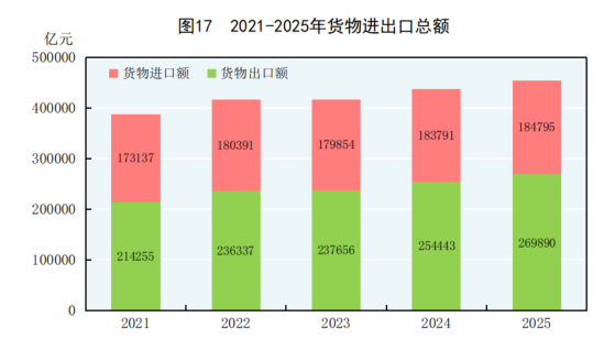 其中指出,全年货物进出口总额454685亿元,比上年增长3.8%。其中,出口269890亿元,增长6.1%;进口184795亿元,增长0.5%。货物进出口顺差85094亿元。对共建“一带一路”国家进出口额236018亿元,比上年增长6.3%,占进出口总额比重为51.9%。其中,出口136851亿元,增长11.2%;进口99167亿元,增长0.1%。对《区域全面经济伙伴关系协定》(RCEP)其他成员国进出口额138503亿元,比上年增长5.3%。民营企业进出口额260403亿元,比上年增长7.1%,占进出口总额比重为57.3%;其中出口176592亿元,增长7.2%。