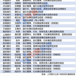 中新经纬梳理发现,截至目前,42家A股上市银行中,包括农业银行、中国银行、光大银行等在内的28家公告聘任首席合规官。整体来看,多数银行首席合规官由行长或副行长兼任,还有部分银行由首席风险官、行长助理等兼任。