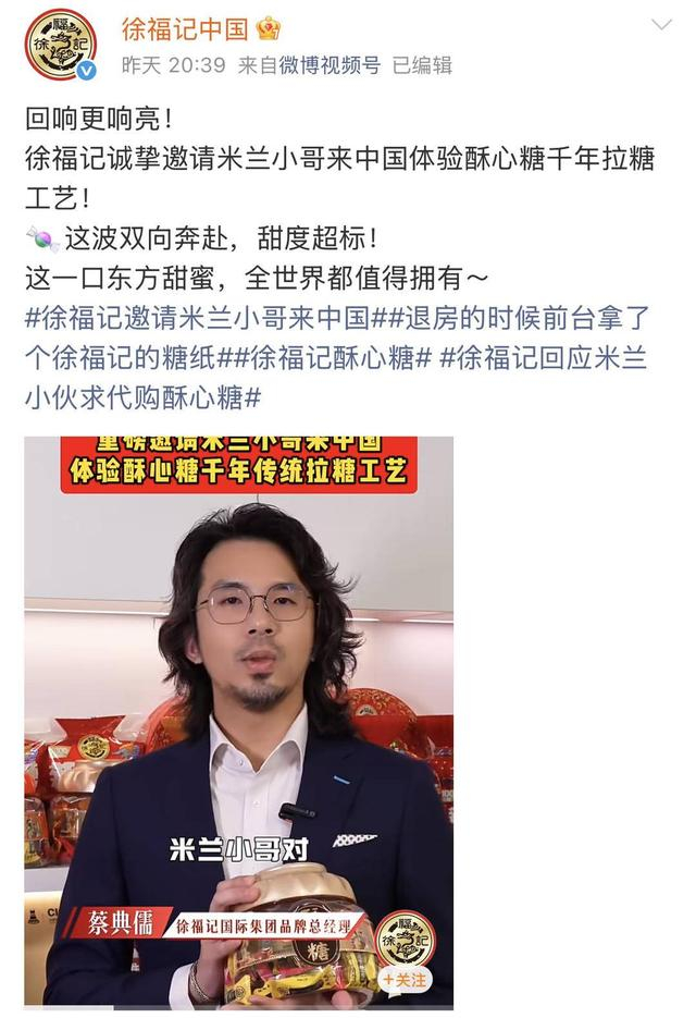 事件热度持续攀升,@徐福记中国官方第一时间关注并作出暖心回应。2月26日至27日,品牌官方接连发布消息,表示已为米兰前台小哥安排满满一箱酥心糖,将这份东方甜蜜尽快送达。更令人惊喜的是,徐福记还正式向这位外国友人发出邀请,欢迎他莅临中国徐福记工厂,亲身体验酥心糖千年拉糖工艺,感受128层糖皮起酥的传统匠心,近距离了解糖果的制作奥秘。