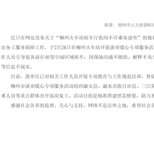 2月26日,柳州市人力资源和社会保障局通过官方网站发布辟谣声明称,当日,该局为贯彻落实就业优先政策,做好重点群体就业和外出务工服务保障工作,在柳州火车站开展就业暖心专项服务活动。工作人员需要提前布置现场、规整座位、清洁卫生等,故引导旅客前往相邻空闲区域候车,因现场沟通不细致、解释不充分,导致个别旅客产生误解。网传“空位不许坐、驱赶旅客”等信息不属实。