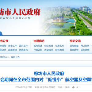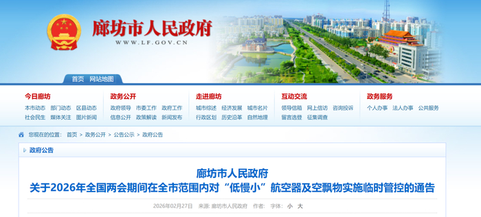 为了维护全国两会期间首都及我市行政区域空中和公共安全,杜绝各类违法违规飞行活动发生,根据《中华人民共和国治安管理处罚法》《中华人民共和国飞行基本规则》《通用航空飞行管制条例》《民用无人驾驶航空器运行安全管理规则》《无人驾驶航空器飞行管理暂行条例》《河北省铁路安全管理规定》《运输机场净空保护管理办法》等有关法律法规、政策文件和上级部署要求,结合我市实际,经市政府研究决定,对无人机等“低慢小”航空器及空飘物实施临时管控,现就有关事项通告如下: