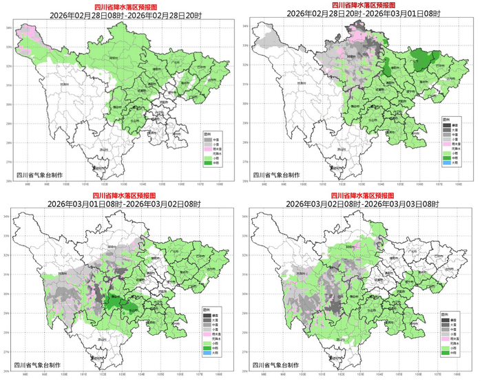 四川省气象台今天早间预报,2月28日至3月2日,盆地有一次降水天气过程,平均气温略有下降;川西高原和凉山州北部有阵雪或阵雨,局地中到大雪,需防范雨雪天气和道路结冰带来的不利影响。