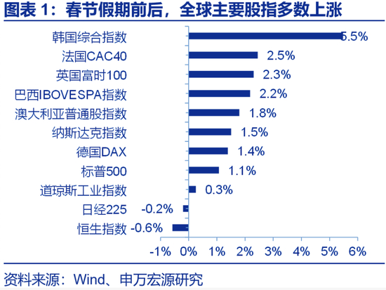 春节期间,海外主要股指多数上涨,原油价格走强;美伊谈判陷入僵局,美方下达最后通牒,美国最高法院判决对等关税违法;国内春节假期出行强度持续上行,传统游、特色游均有升温。