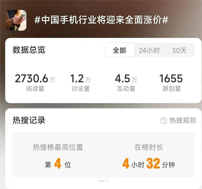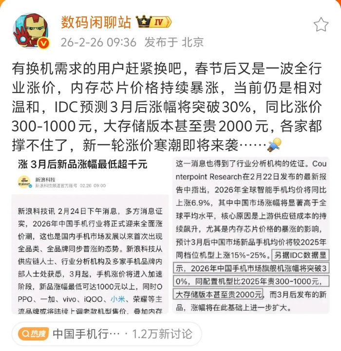 2月26日,“中国手机行业将迎来全面涨价”冲上微博热搜第四,大家的购机焦虑直接拉满。