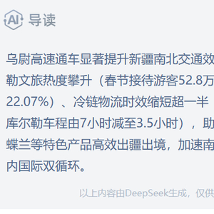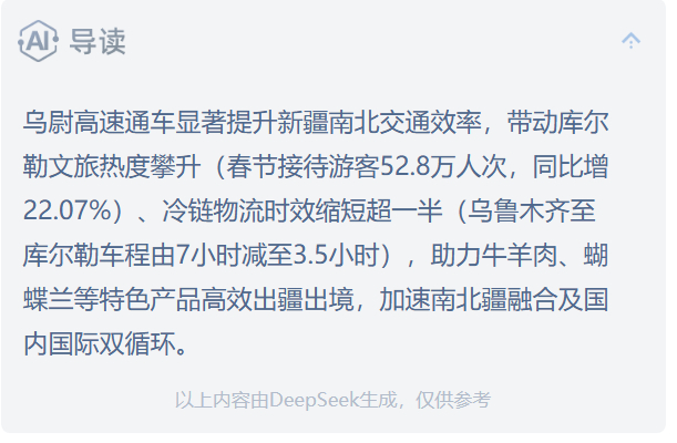 乌尉高速不仅串联起“北疆城市带”与“南疆城市群”,加速南北疆商贸物流、文旅资源流动,为新疆高质量发展注入强劲动力;还高效联通新亚欧大陆桥、中国至中亚、西亚等多条经济走廊主动脉,为畅通国内国际双循环发挥重要助推作用。