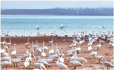 在山西运城市平陆三湾大天鹅景区栖息的白天鹅。