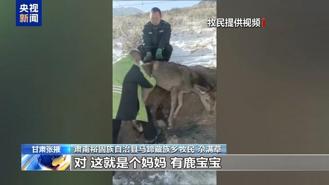 肃南裕固族自治县马蹄藏族乡牧民 尕满草:祁连山不光是我们的家,它也是野生动物们的家。因为保护得好,现在我们下山借牧了,它们繁殖得越来越多,它们要从树林里山上下来找吃的,经常翻越围栏的时候别在那儿了。这是鹿,围栏已经勒到它肚子上了。这个是妈妈,有鹿宝宝,它们万一受伤了,没人看,天这么冷,它们就会被冻死饿死。隔三岔五我们会上来看一下。