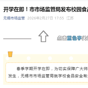 春季学期开学在即,为切实保障广大师生饮食安全,预防校园食品安全事件发生,无锡市市场监管局就学校食品安全有关事项提示如下: