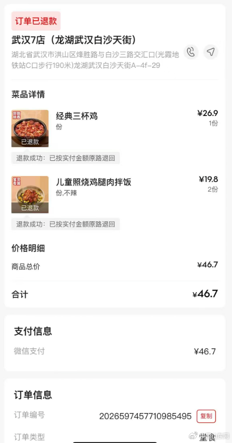 据陈女士介绍,2月25日她在该门店点了经典三杯鸡和儿童照烧鸡腿肉拌饭,共计消费46.7元。食用过程中,她发现儿童照烧鸡腿肉拌饭的米饭内混有异物,仔细辨认后确认为两根黑色卷曲毛发,且已与米饭充分搅拌。陈女士当即向门店店长反映情况,要求给出合理解释并依法赔偿。店长现场称,店内员工均按规定佩戴帽子、口罩,否认异物来自操作环节,仅表示将调取监控核查,未正面回应消费者诉求。