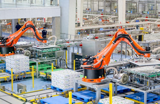 伊利现代智慧健康谷液态奶全球智造标杆基地内,机械手在码放牛奶。