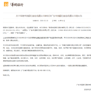 珠海华润银行表示,上述名称变更事项已于2026年2月11日获得国家金融监督管理总局广东监管局核准批复,并于2026年2月26日完成相关工商登记变更手续,取得《营业执照》。本次仅为机构名称变更,该行原有的业务关系、法律关系、服务承诺均保持不变。以“珠海华润银行股份有限公司”名称签署的各类合同、协议、文件在其有效期内继续有效;客户所持该行原名称的银行卡、存单、存折、电子账户等产品载体均有效;该行原有营业网点、客服热线、网上银行、手机银行等服务渠道均保持不变。该行各分支机构在完成本级机构名称变更所需履行的全部法律程序之前,各类文件、合同、协议等使用原名称发布、签订,原印章(含实物章、电子章)继续使用。该行银行卡、存单、存折、业务单据、协议、合约等产品载体,以及官网、App、公众号、互联网平台等电子渠道将陆续完成银行名称及标识变更。