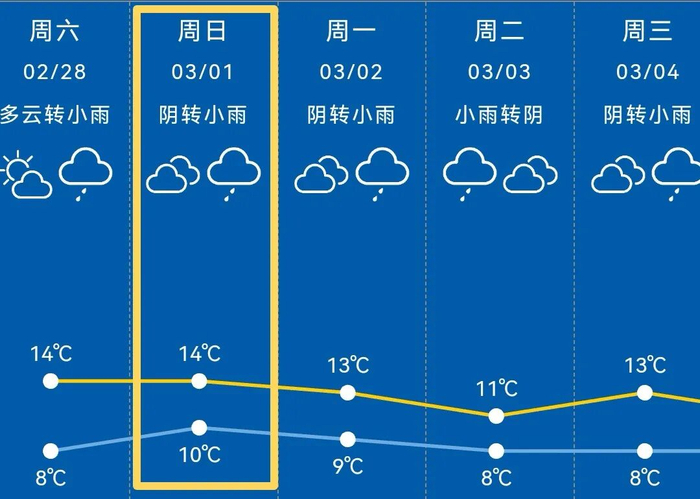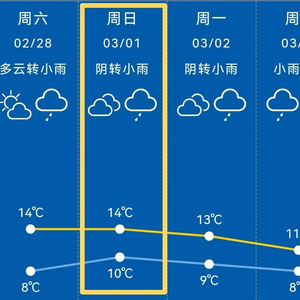 ■下周工作日多降水天气过程,双休日天气转好,气温略有波动。最低气温在4℃至8℃之间,最高气温在11℃至14℃。未来一周多阴雨,湿度大,体感偏湿冷。